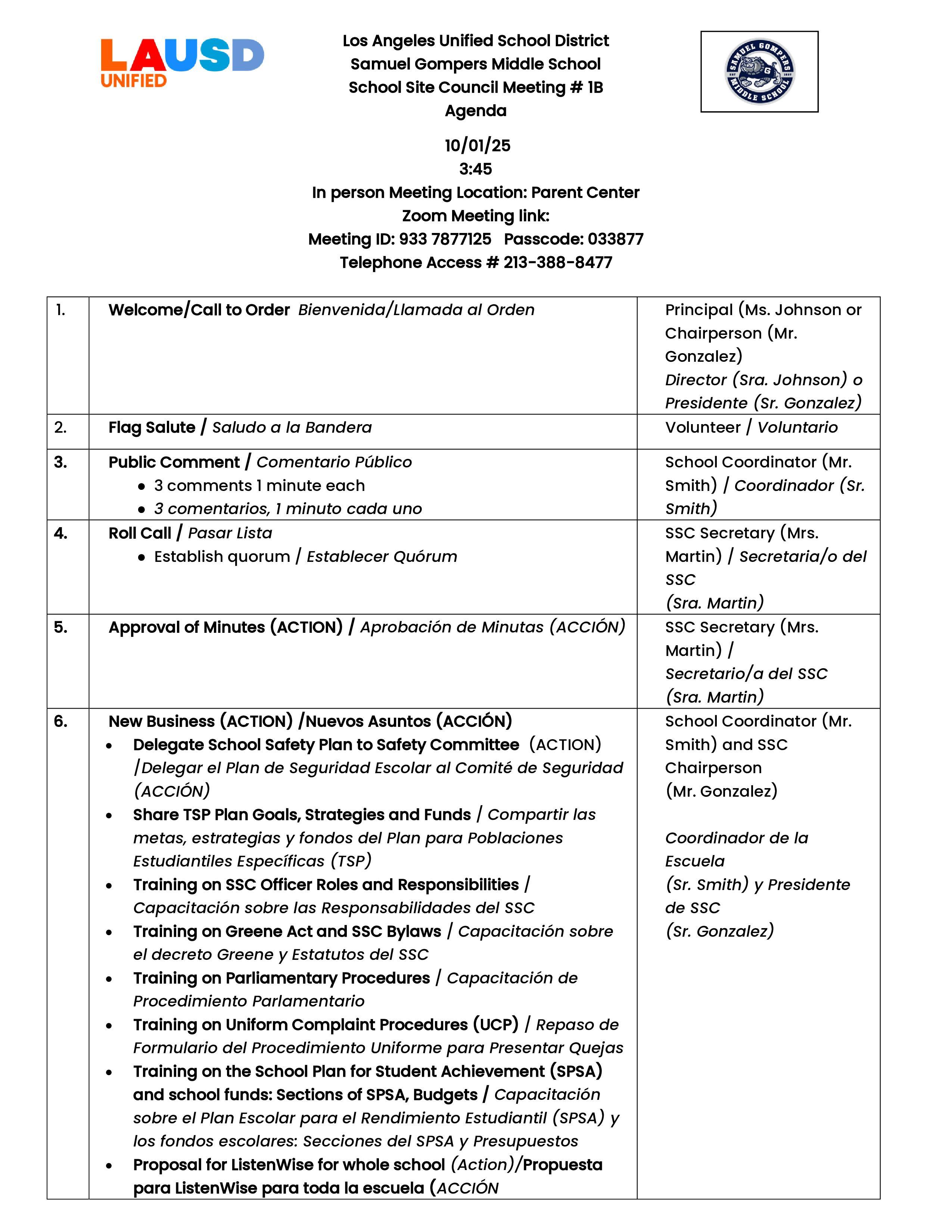 Election of School Site Council Officers School Site Council Meeting #1B Agenda